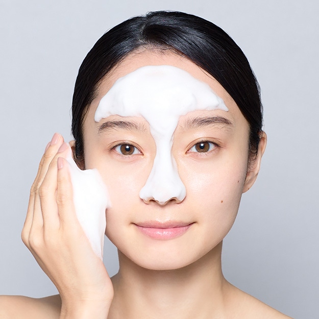 皮脂が多いTゾーンを先に、その後に乾燥しがちなVゾーンを洗います。泡を手でつぶしてしまうのはNG。手は肌に直接触れずに泡のクッションを転がすようにしながら、手のひらでやさしく包み込むように洗います。小鼻の横やあごのくぼみは、指先でくるくるらせんを描くようにして毛穴※1のすみずみまで泡を届けるように洗いましょう。