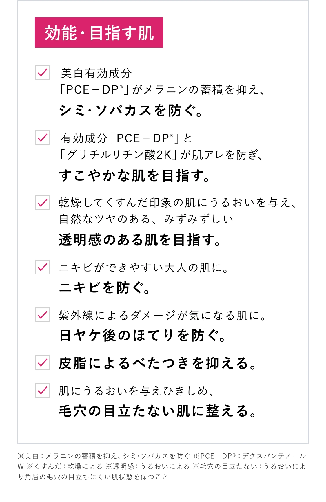 効能・目指す肌 シミ・ソバカスを防ぐ うるおいのある素肌を目指す 肌アレを防ぐ 自然なツヤのある肌を目指す 毛穴の目立ちにくい肌を目指す 肌をすこやかに保つ 詳細はこちら