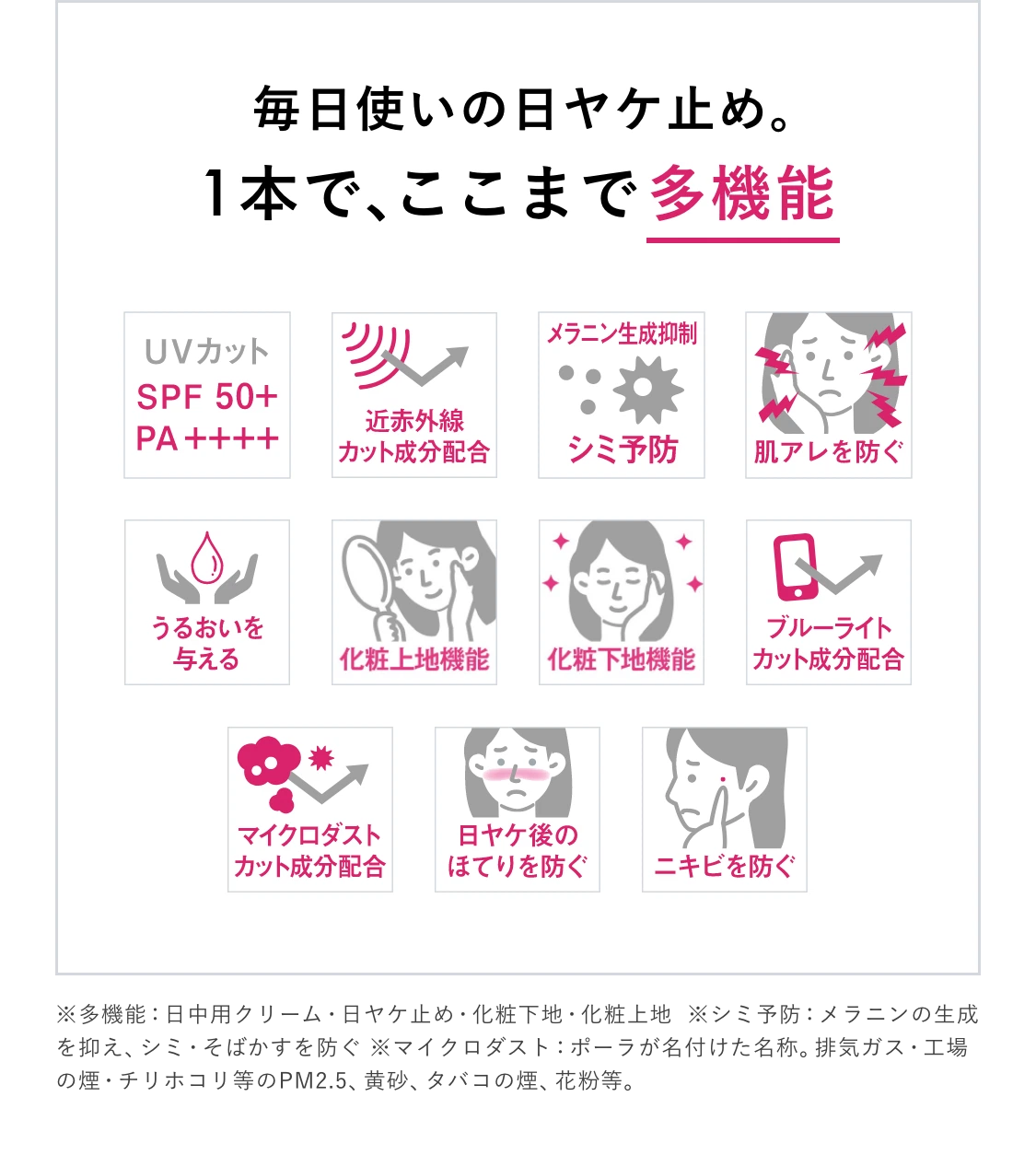 ホワイトショット セラムUV 詳細はこちら ※美白:メラニンの生成を抑え、シミ・ソバカスを防ぐ ※多機能:日中用クリーム・日ヤケ止め・化粧下地・化粧上地