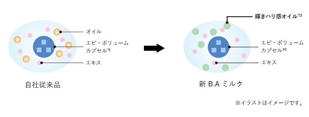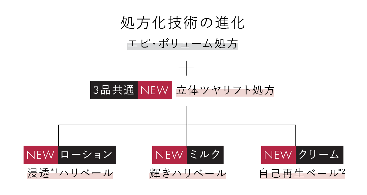 今までB.A に採用していた処方設計「エピ・ボリューム処方」に加え、ローション、ミルク、クリーム1品1品でハリを追い求め、うるおい・輝き・立体感のある全域ハリを目指す処方設計「立体ツヤリフト処方」を新採用。