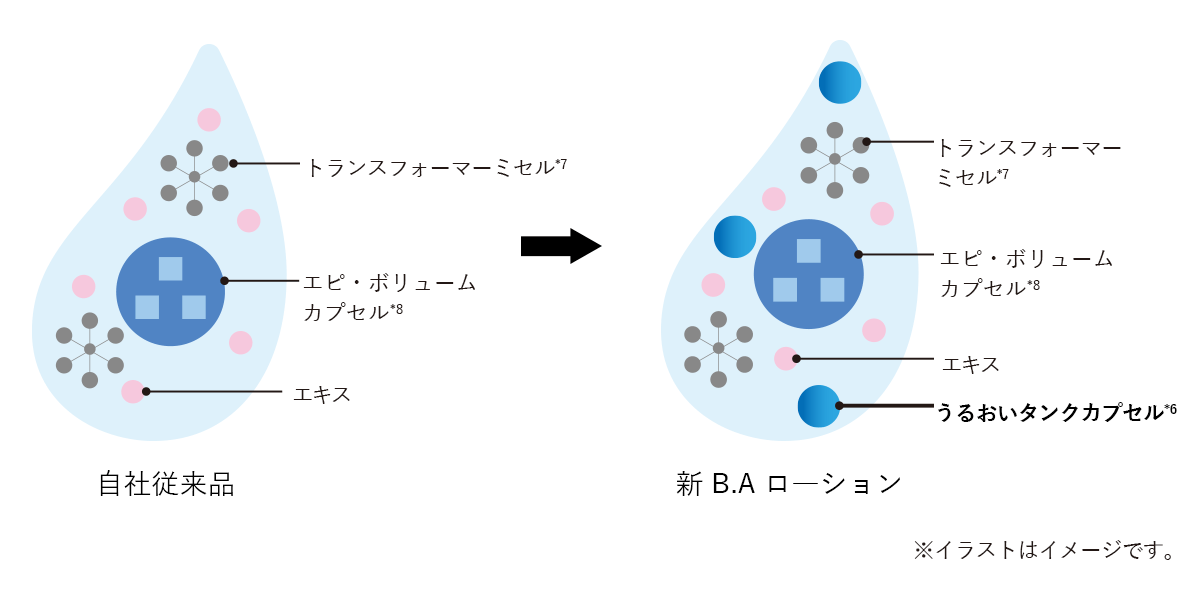 濃密感触なのに、すばやい浸透感。新たに「うるおいタンクカプセル*6」し、浸透ハリベールを形成。角層の隙間を埋めるように浸透し、うるおいを抱え込みキープ。