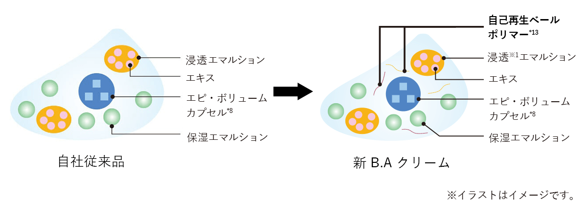 ハリと立体感に着目。新たに「自己再生ベールポリマー*13」を配合し、押し返すような自己再生ベールを形成。ベールは形状復元性アップに加え、水分保持量は約140%にアップ*9。