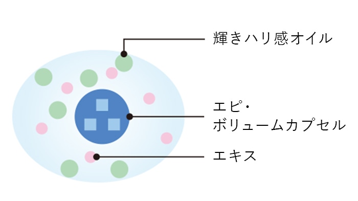 - エピボリュームカプセル:シリカ、アルギニン、ジメチコン、クエン酸、ベヘニルアルコール、グリコール酸、ゼイン