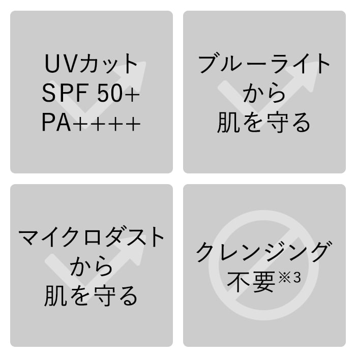 紫外線・近赤外線・ブルーライト・マイクロダスト*2カット成分配合。クレンジング不要で、洗顔料だけで落ちる*3処方設計。