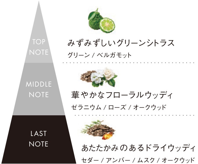 透明感のあるグリーンを立たせた、みずみずしい華やかさを感じる香り。