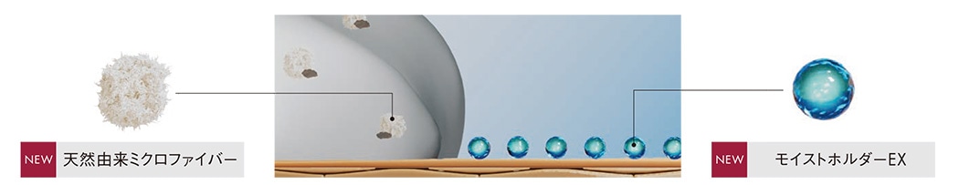 TDC*3新開発の天然由来ミクロファイバーで皮脂汚れを吸着。糖化したデスモソーム*4を含む古い角層を洗い流します。さらに、自社従来品比約10倍の保湿オイルを配合したオイルエマルション「モイストホルダーEX」を配合。うるおいを抱え込み、しっとりと透明感のある洗い上がりへ。