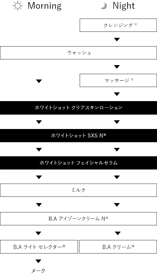 - フェイシャルセラム、SXSはメラニンの生成を抑え、シミ・ソバカスを防ぐ。クリアスキン ローションはメラニンの蓄積を抑え、シミ・ソバカスを防ぐ。
