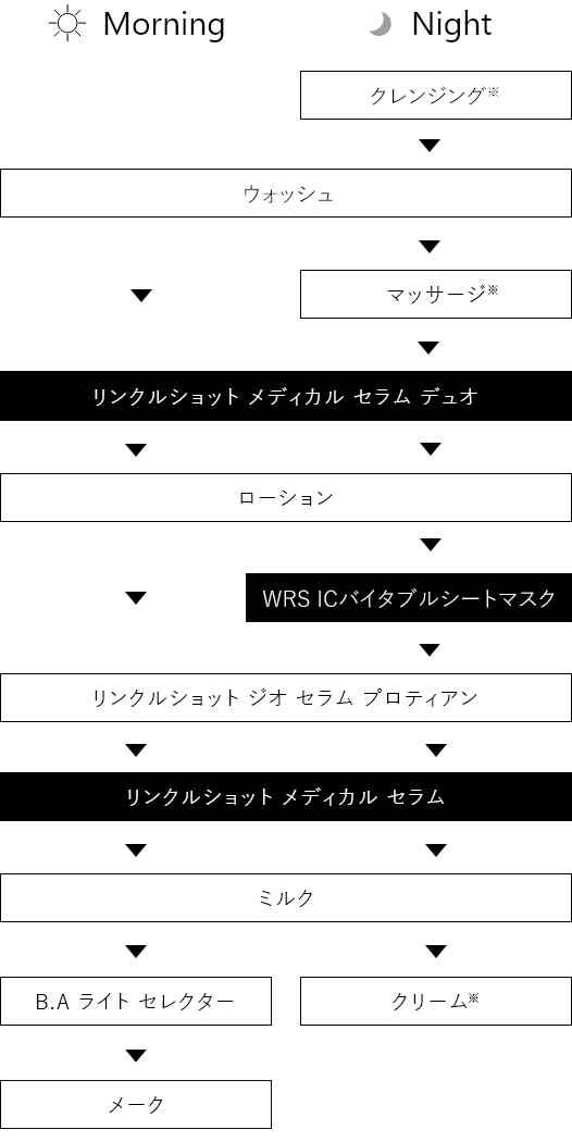 - オールインワンアイテムをご使用の場合は、オールインワンアイテムのあとに「リンクルショット ジオ セラム プロティアン」 「リンクルショット メディカル セラム」をご使用ください。
