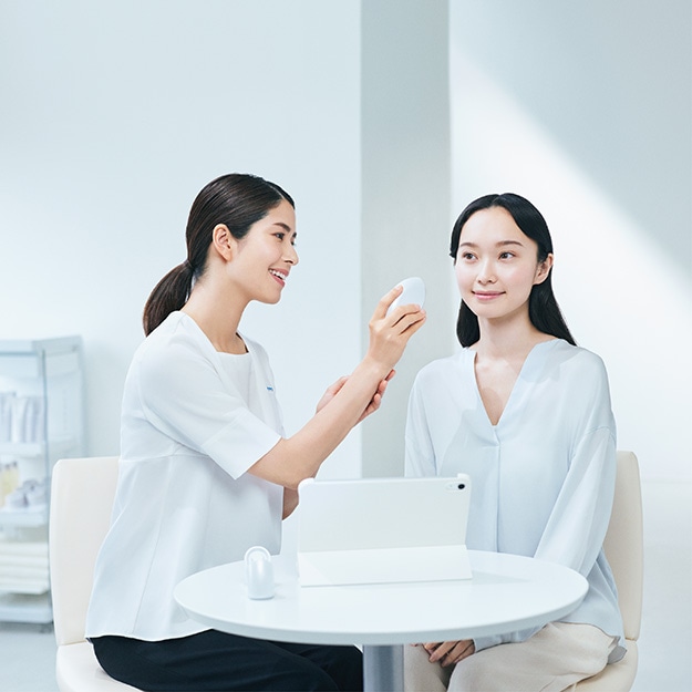 店舗にご来店いただき、カウンセリングや肌分析を通して、お悩みやご希望にあったメニューを決めます。
